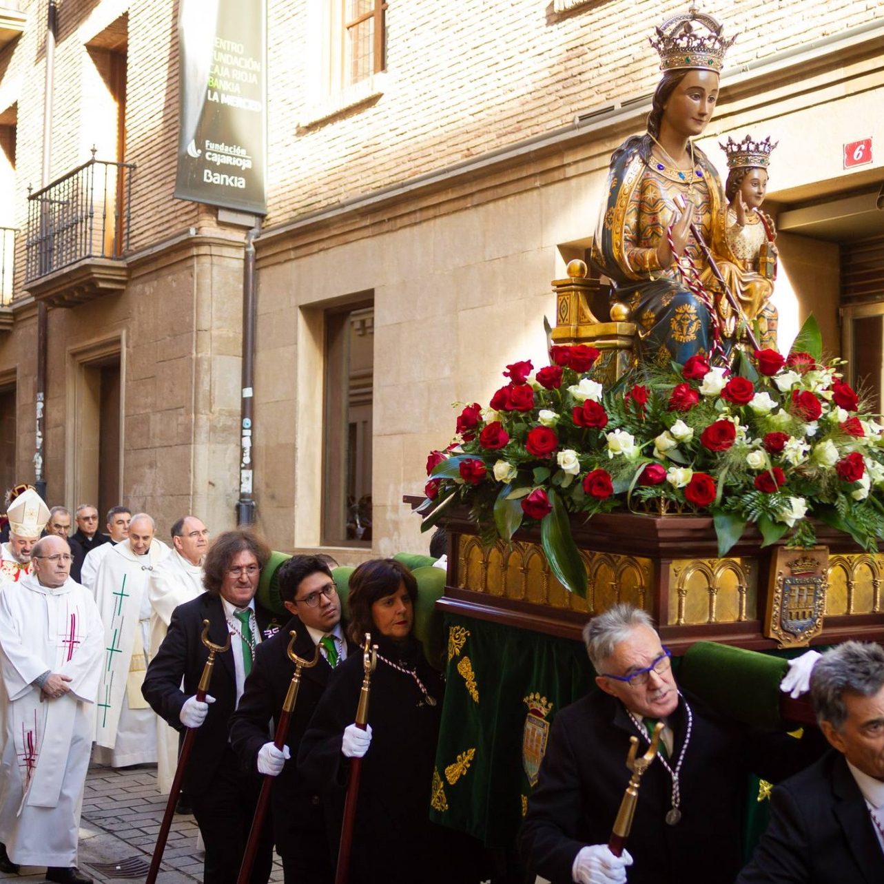 Tras la celebración de la misa solemne presidida por el Obispo, en la que el Alcalde presenta sus peticiones para la ciudad ante la Patrona de Logroño, salimos en procesión por las calles de Logroño
